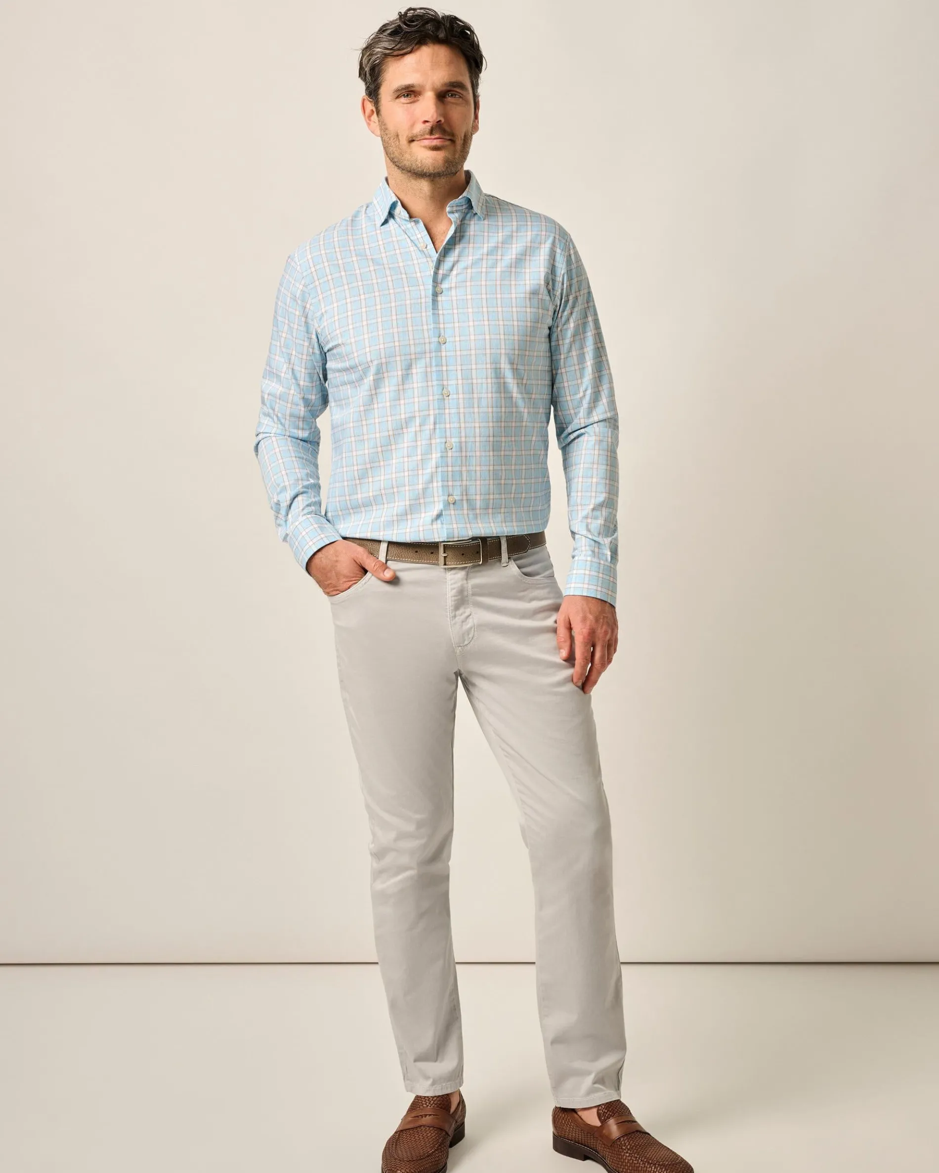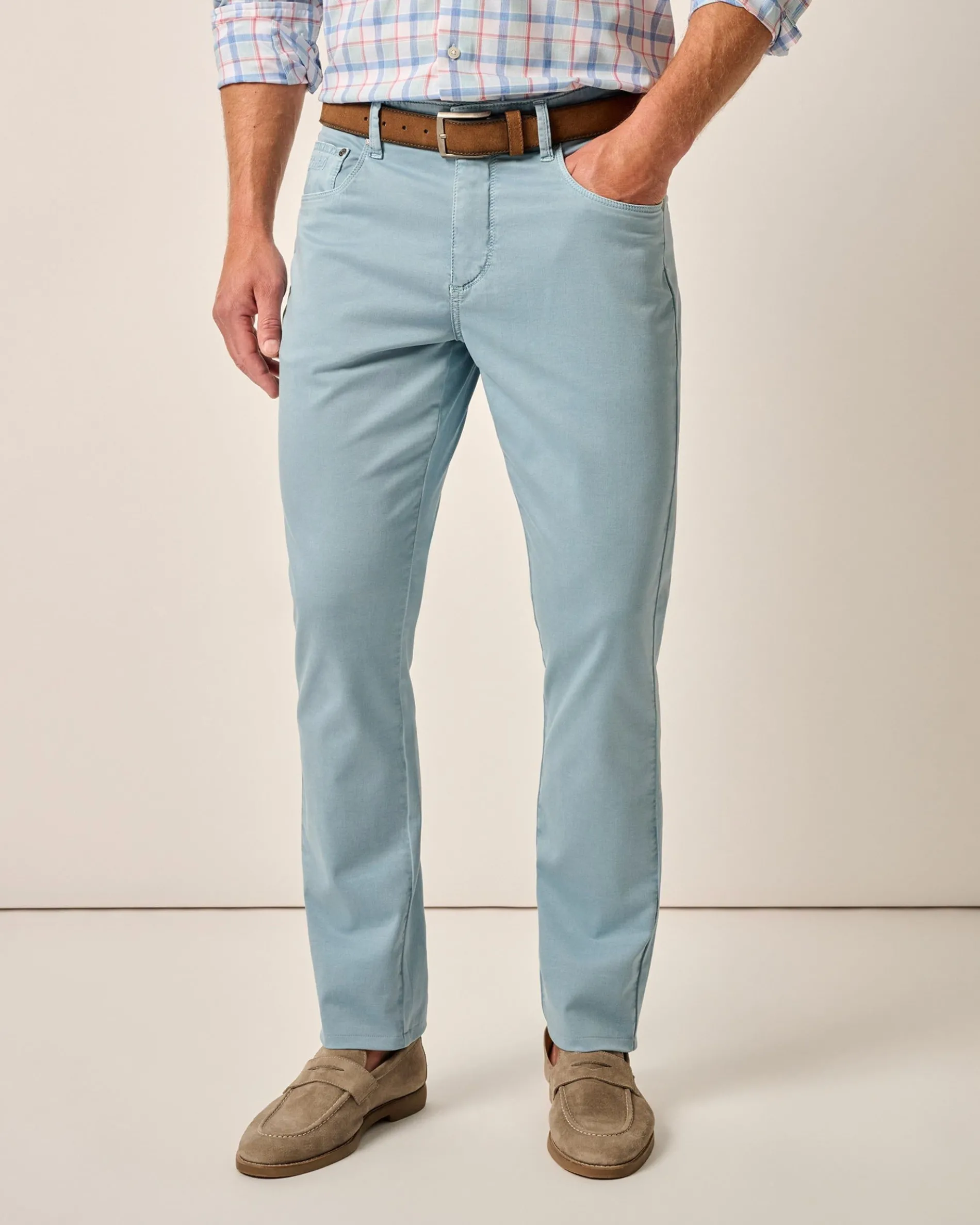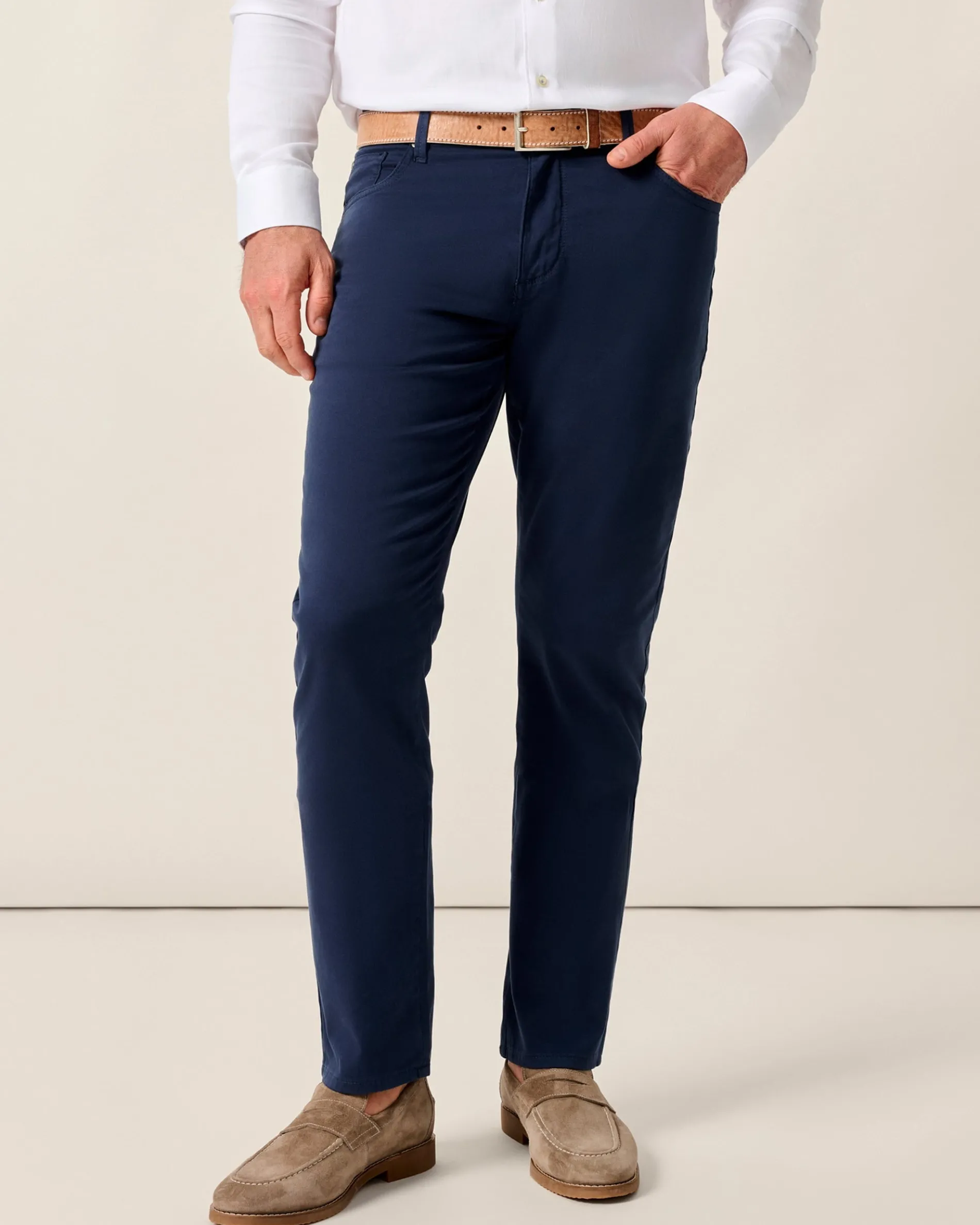 This refined sateen woven pant is garment-dyed for a broken-in look and made with very lightweight material perfect for dressier nights.