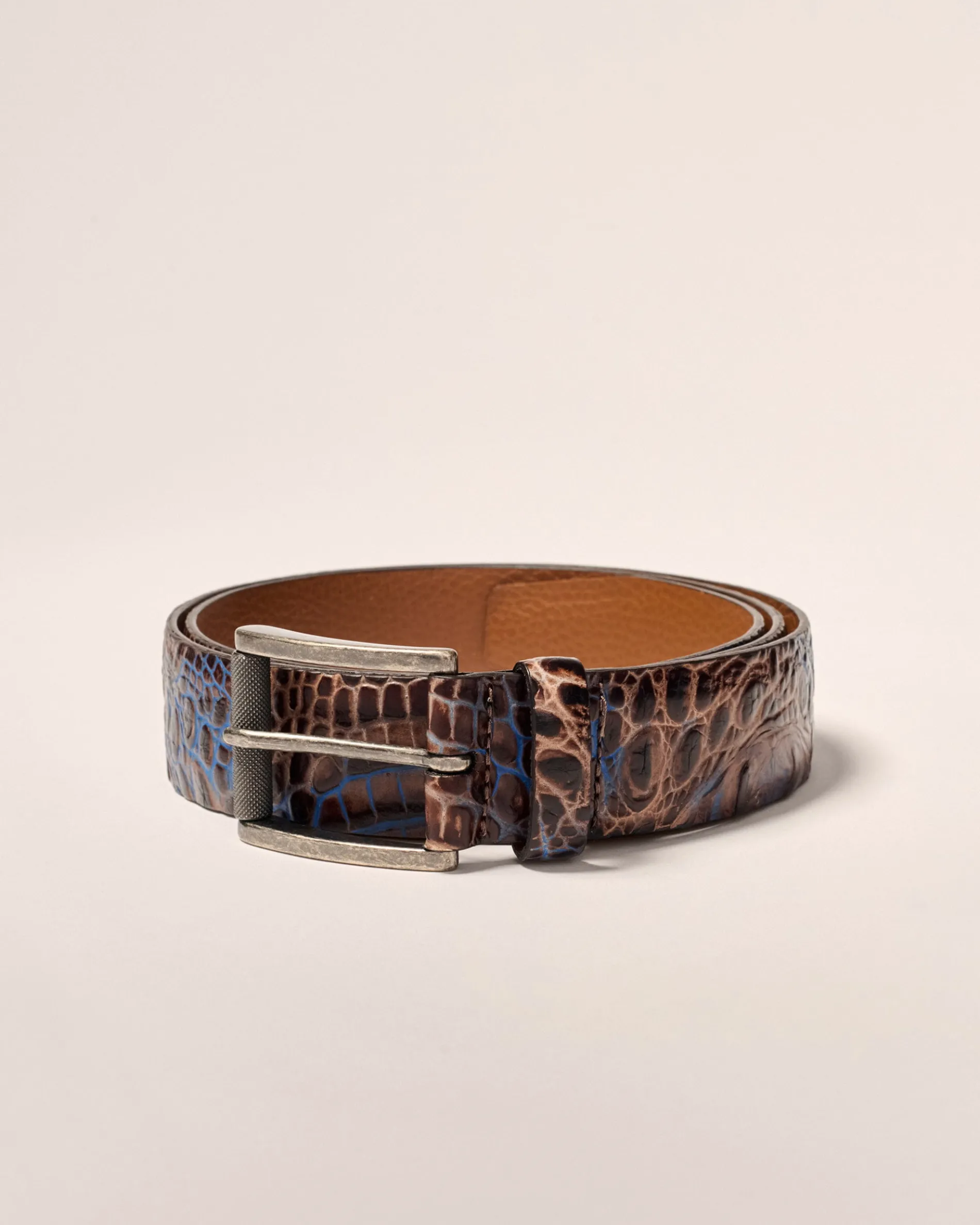 Our unique take on the crocodile belt. The Crocco Belt is made with premium Italian leather and is hand-burnished for a smooth, embossed look.