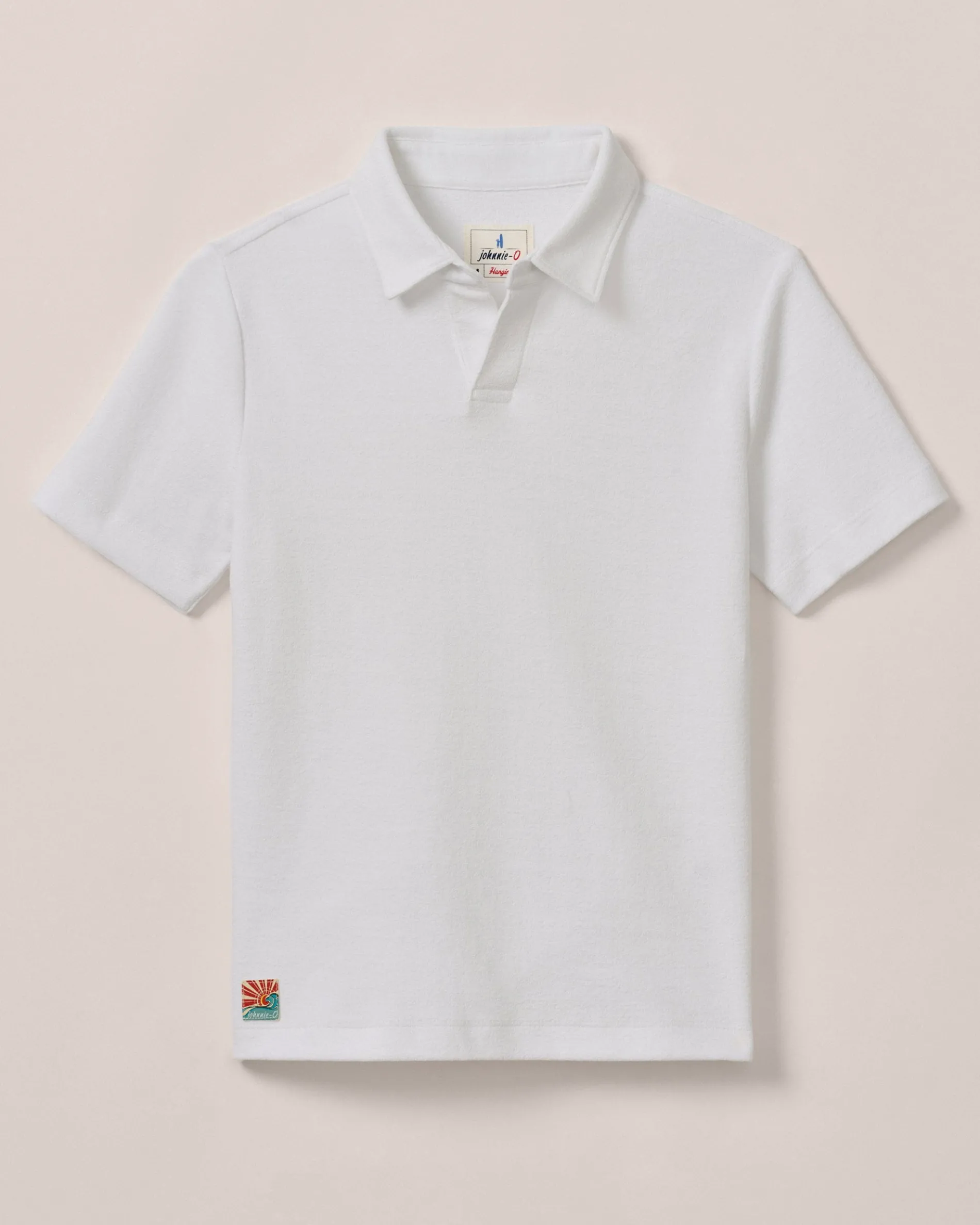 The ultimate poolside style, this terry polo harkens back to the day when lounging under a beach umbrella in the Hollywood Hills was a full-time job. It’s made with a lighter version of the fabric used for ultra-luxe towels and it’s made with a Johnny collar polo—a mark of the 60s worn by all your favorite style icons.