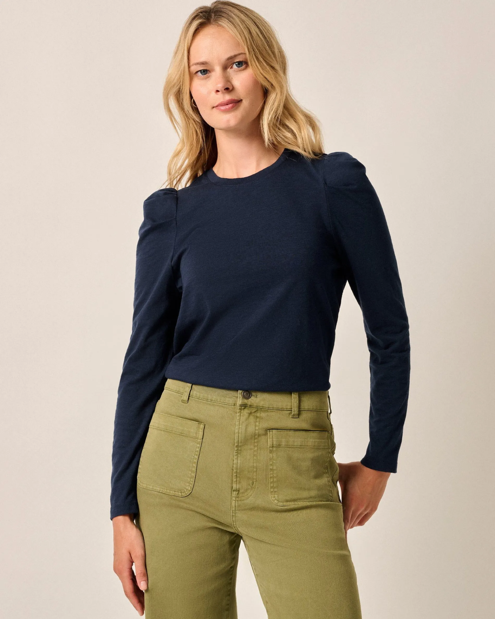 Enter the easy fit tee, dressed up with shirred puffed sleeves. This soft, stretchy tee is an obvious choice for pairing with jeans or chinos for easy everyday style.